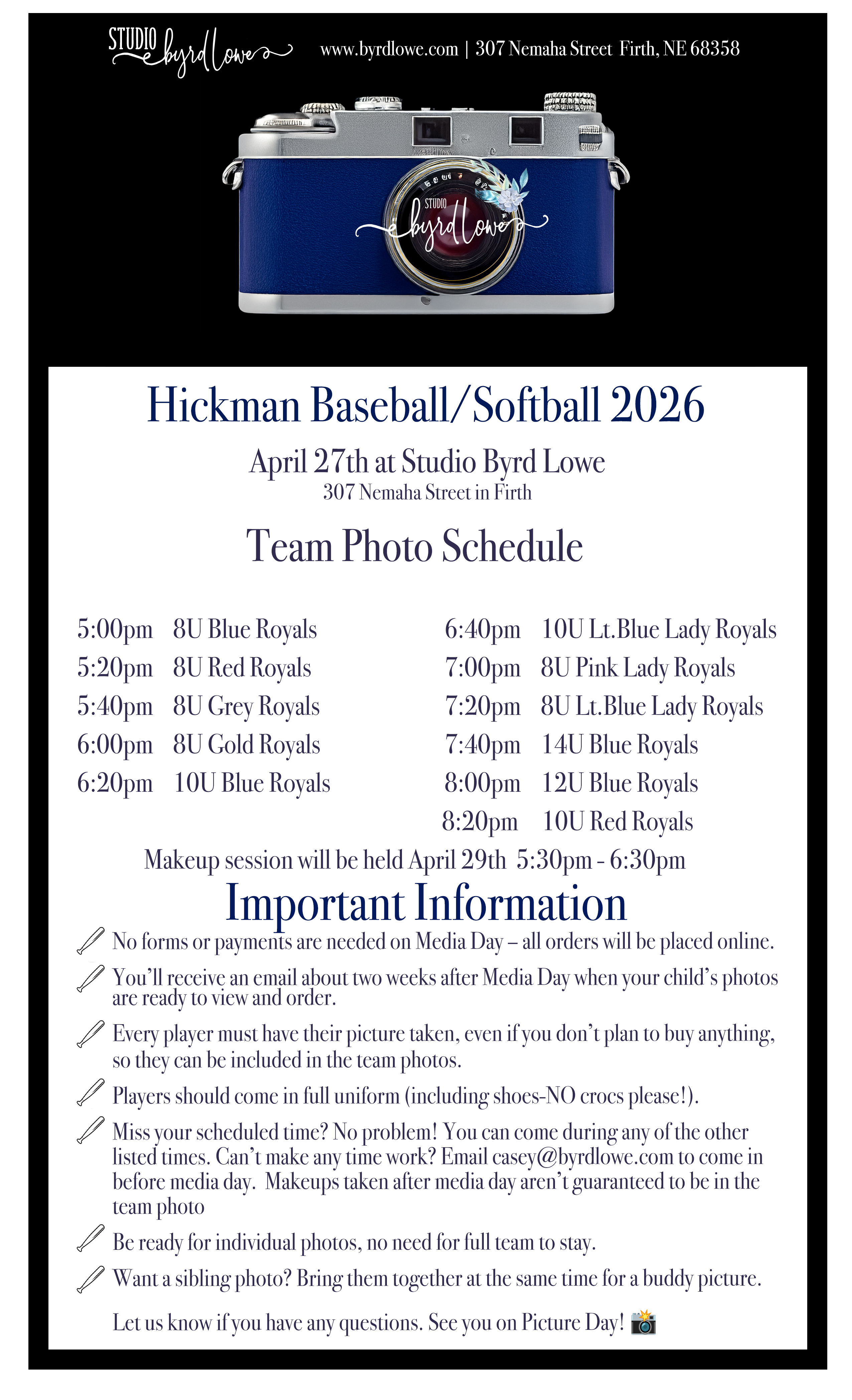 Hickman Area Royals Baseball and Softball: Player and coach pitch teams participate in the Blue River Leagues (BRL). These leagues travel to communities such as Malcolm, Crete, Seward, Milford and more for games. Home games are played at Hickman Main Park. The games generally take place from early May through late June. Baseball games are mainly played on Tuesday and Thursday evenings and softball games are generally played on Monday and Wednesday evenings.